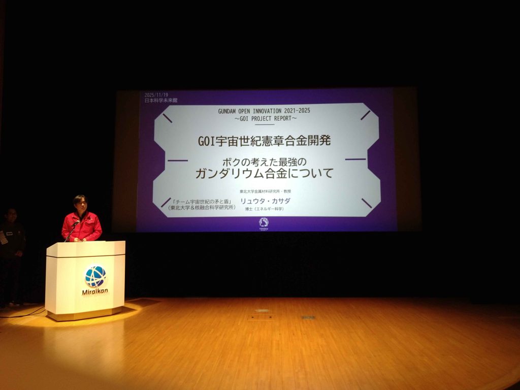GOI成果報告会(笠田、山村) 2025年11月18,19日に日本科学未来館で開催されたGOI(ガンダムオープンイノベーション)成果報告会において、笠田教授と山村君(D1)が登壇しました。GOI宇宙世紀憲章の作製秘話について語り尽くしてきました! GOI宇宙世紀憲章の成果報告 パネルディスカッションに登壇