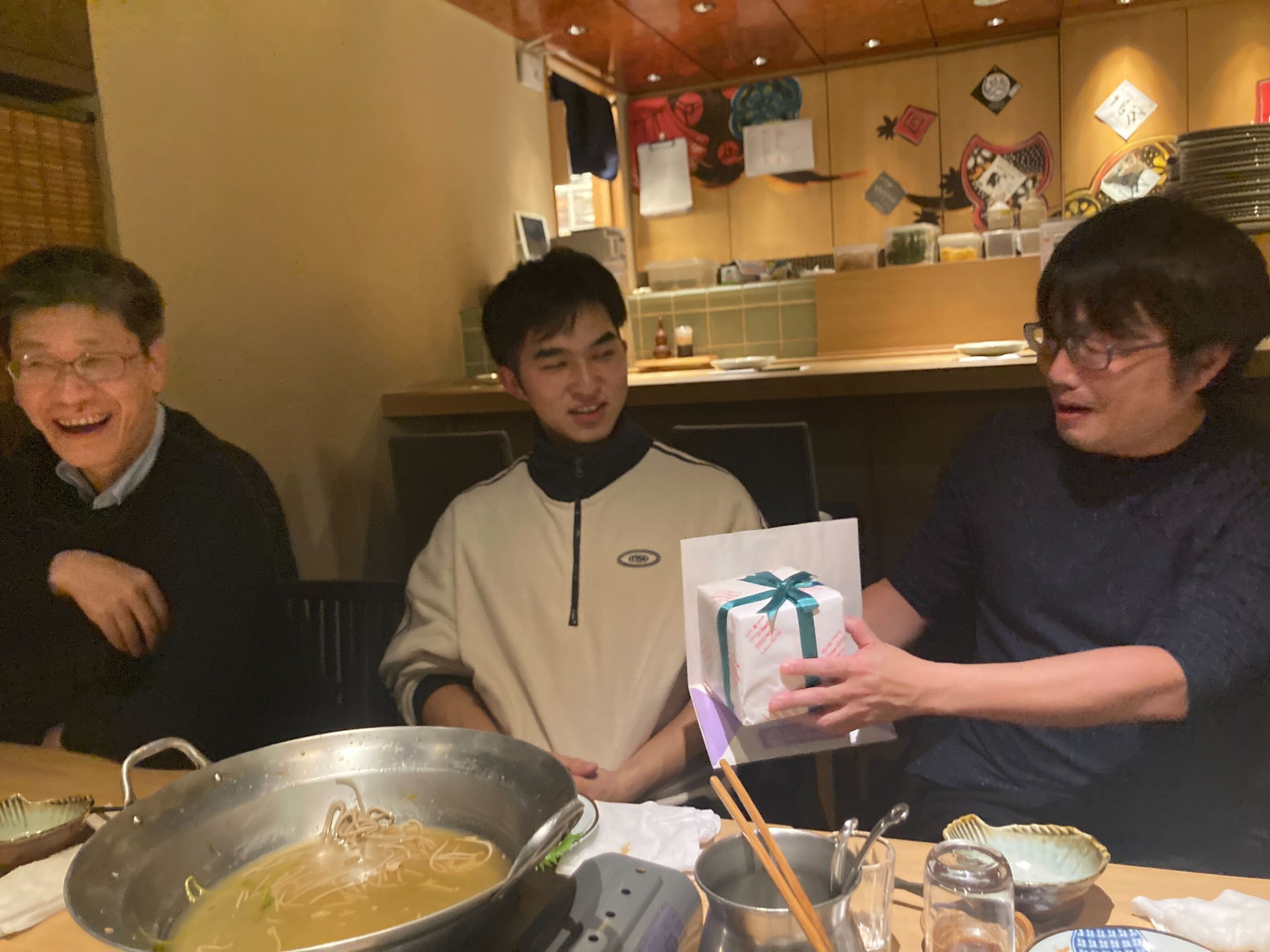 2025年12月 忘年会・今井 良宗 准教授の壮行会を行いました! 教授から准教授へのプレゼントも渡されました。