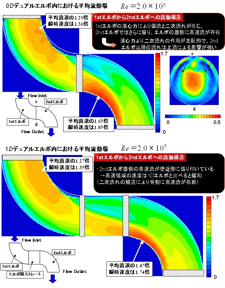 エルボ管内の流れは、エルボ管の連結方法によって変化します。この流れの変化を知ることで、