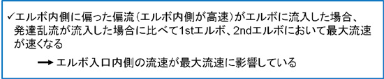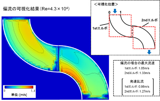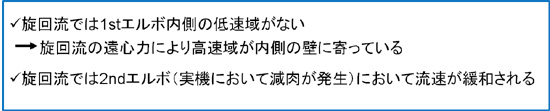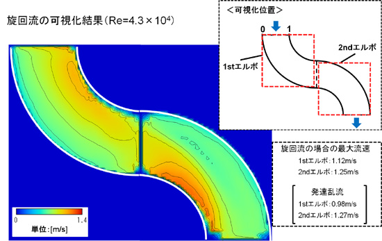 そこで、デュアルエルボの入口流入条件を偏流もしくは旋回流にすることで、