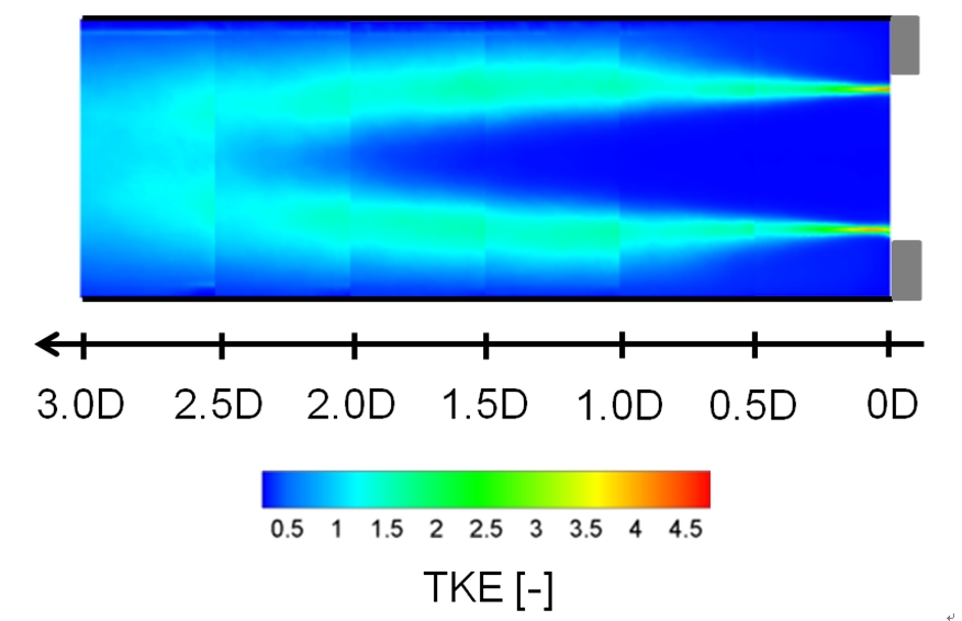| オリフィス下流の乱流エネルギー分布(Re = 1.0×105) |
