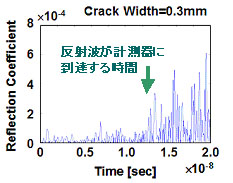 マイクロ波がマイクロ波発振器からき裂に到達し、反射して検知器に戻ってくるまでの時間(計算値)と反射振幅比が大きくなり始める時間(実験値)が一致しています。