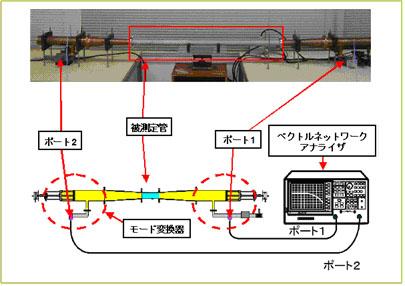 Fig. 4に実験体系を示します。マイクロ波発振器(ベクトルネットワークアナライザ)から発振されたマイクロ波はモード変換器を経由して、被測定管に到達し、被測定管を透過した透過波、被測定管で反射した反射波をベクトルネットワークアナライザで計測します。