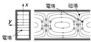 現在、主に使用されているマイクロ波発振器は矩形(長方形)導波管に接続されています。矩形導波管内ではFig.6のような電場、磁場が形成されます。