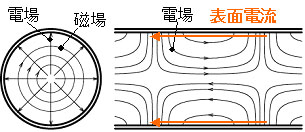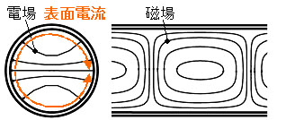 表面電流が軸方向に流れる。