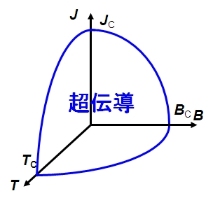 図1-2に示すように磁場や電流密度に関しても同様に、超伝導状態から常伝導状態に転移する値が存在します。