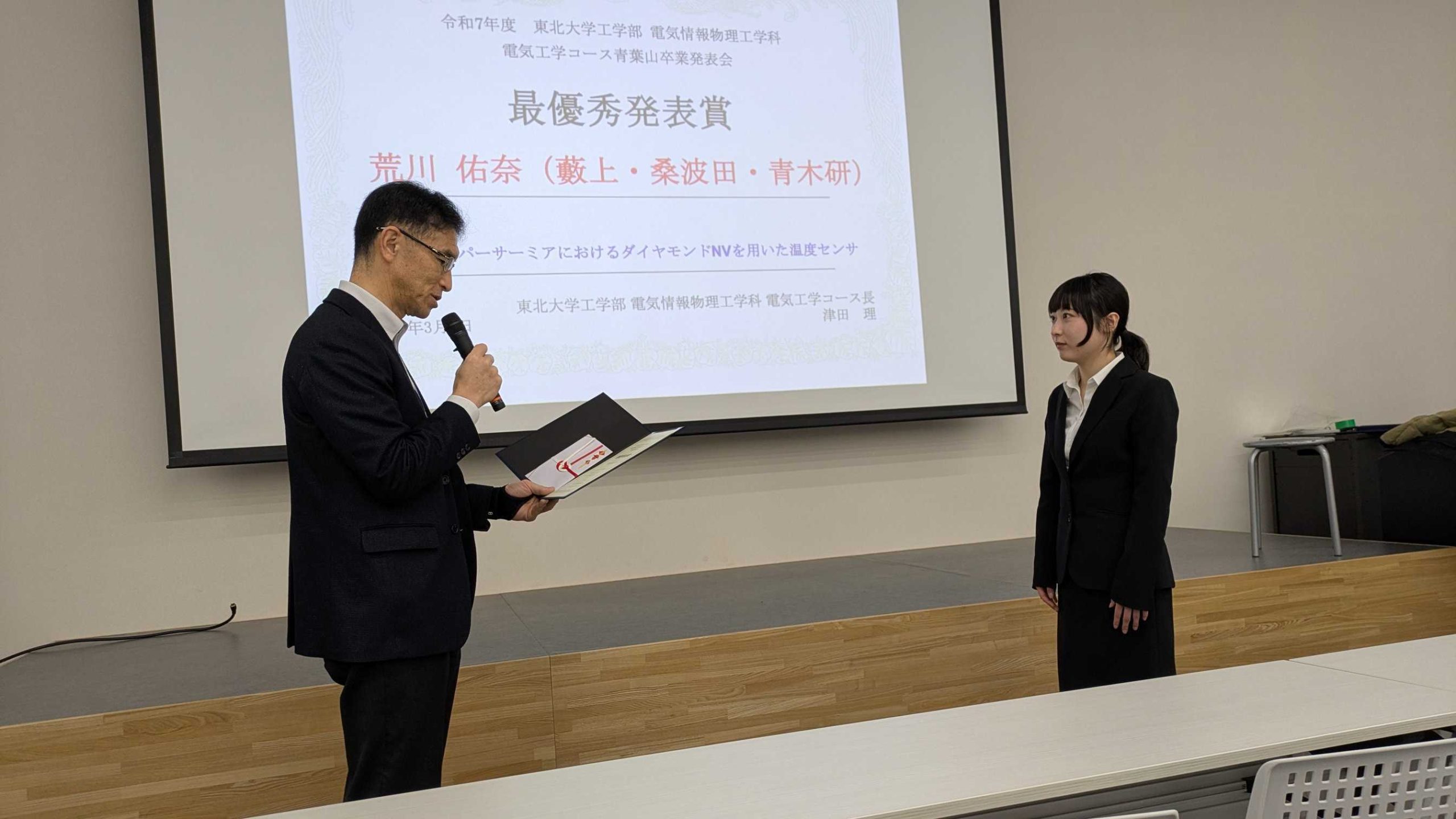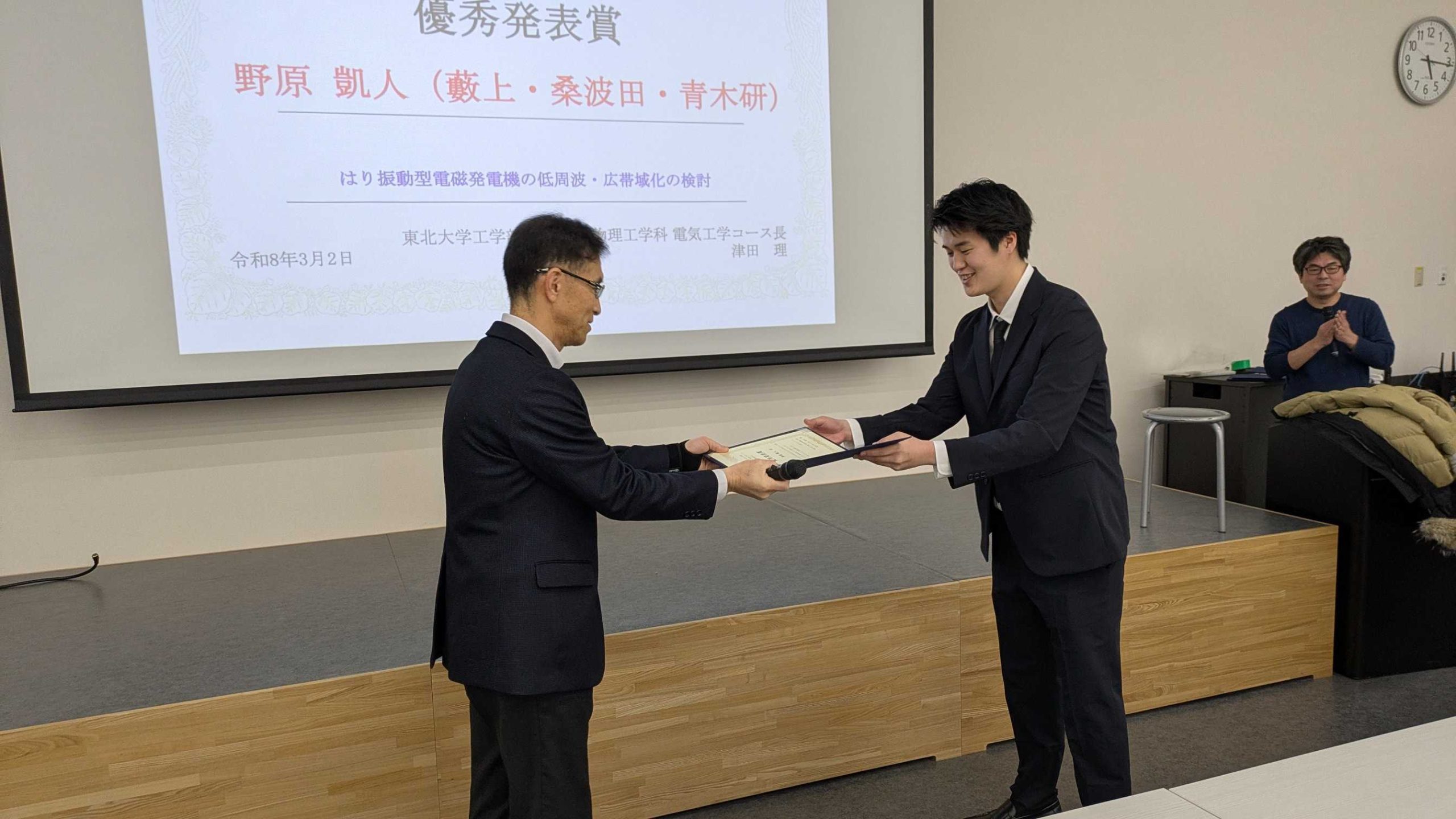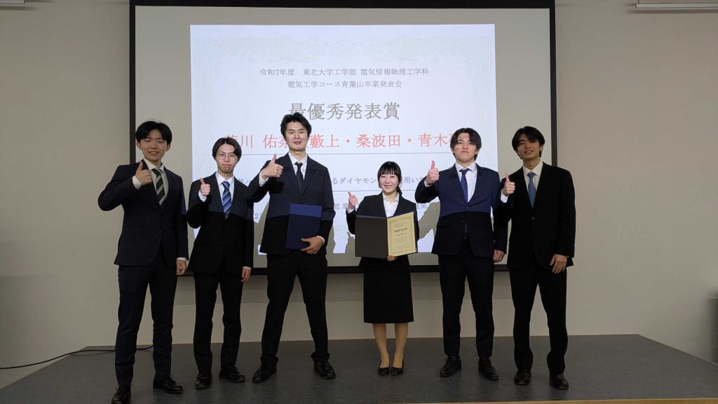 On Monday, March 2, 2026, the Electrical Engineering Course (Aobayama) held its Graduation Research Presentation Session (posters, at Fukko Hall). From our laboratory, Mr. Arakawa, Mr. Kitakaze, Mr. Sato, Mr. Fukuoka, Mr. Shiraishi, and Mr. Nohara gave explanations and handled questions. They engaged in enthusiastic discussions with students from other laboratories and faculty members of the Electrical Engineering Course, creating a lively atmosphere. Following last year’s winner, Mr. Takamatsu, Mr. Arakawa received the Best Presentation Award (only two awarded per year) and Mr. Nohara received the Excellence Award. Congratulations! On the way back, Professor Tsuda, the course director, also praised us, saying, “Many of the Yabukami Lab presentations featured clear explanations.” Yabukami was very pleased to hear this. I believe the repeated guidance we received beforehand from Professors Kuwabata and Aoki, and Mr. Roy, on the presentation content and posters, was crucial. Please continue to listen carefully to your professors’ advice and opinions, maintain this momentum for the IEICE National Conference and your master’s thesis research, and strive hard as working professionals. (Text by Yabukami))