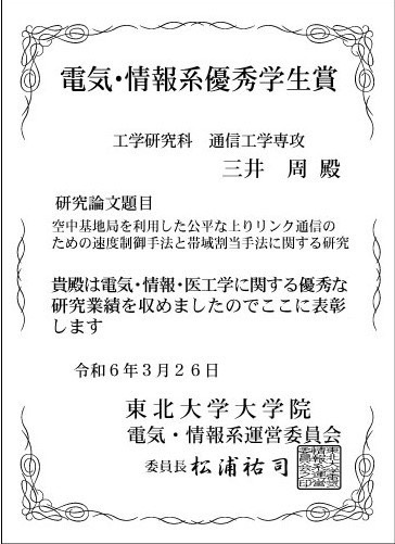 2024年4月9日 / 最終更新日時 : 2025年9月22日 通信方式分野 受賞 三井さん(M2)が電気・情報系優秀学生賞を受賞 2024年3月26日、三井さん(M2)が電気・情報系優秀学生賞を受賞しました。