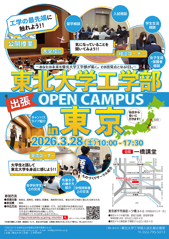 東北大学工学部では、首都圏を始めとした全国の高校生・高専生・受験生の方に東北大学工学部の魅力について知っていただくための出張オープンキャンパス「東北大学工学部 in 東京」を2026年3月28日(土)に東京・竹橋の一橋講堂で開催します。