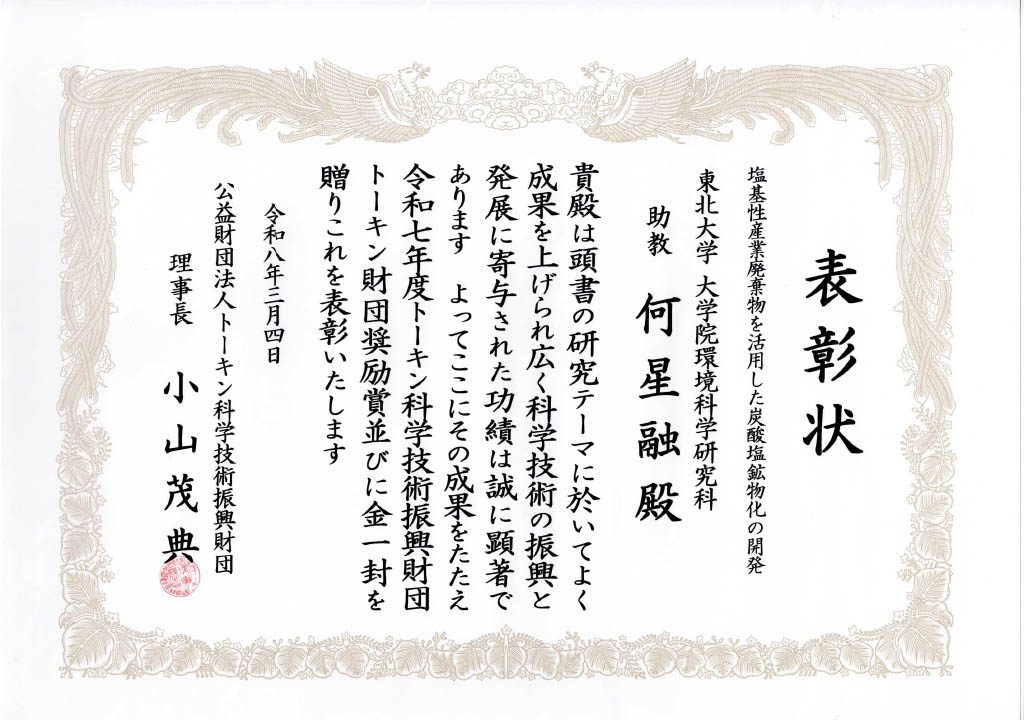 Assistant Professor Ho received the Tokin Science and Technology Award at the 36th Tokin Science and Technology Award Ceremony (2025), held at the Sendai International Hotel from 6:00 PM on Wednesday, March 4th. The awarded theme was “Development of Carbonate Mineralization Using Basic Industrial Waste.”
