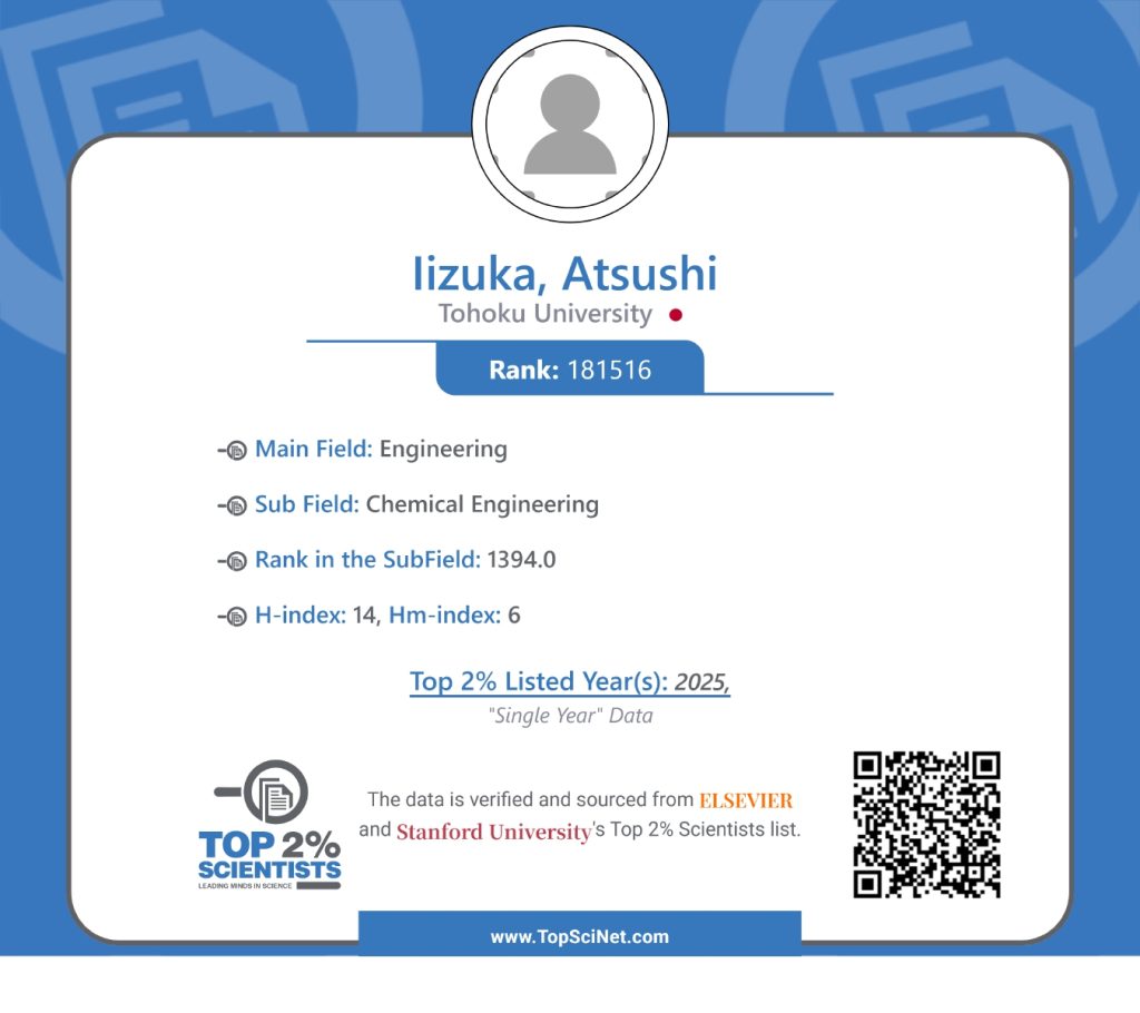 飯塚先生がスタンフォード大学とエルゼビア社が2025年9月19日に公開した世界のトップ2%の科学者を特定する包括的なリスト「標準化された引用指標に基づく科学者データベース(更新版)」に、 環境科学研究科から “single recent year”の区分で選出されました!