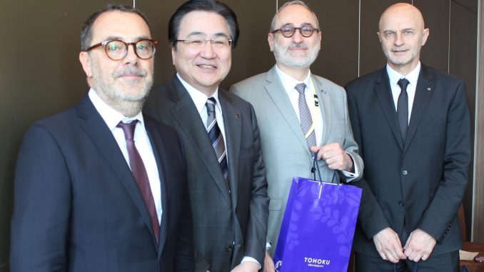 3月9日(月)、東北大学で開催されたELyTMaX & ELyTGlobal 10周年記念式典に伴い、フランス国立応用科学院リヨン校(INSAリヨン)のフレデリック・フォチャデュ学長、国立中央理工学校リヨン校(Central Lyon)のパスカル・レー学長、フランス国立科学研究センター(CNRS)のリォネル・ブシャイオ工学部門長らが本学を訪問し、冨永梯二総長らとの面談を行いました。本学からは、冨永総長のほか、植木俊哉理事・副学長や杉本亜砂子理事・副学長らが同席しました。