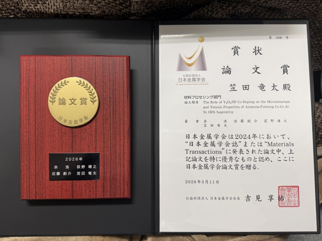 日本金属学会第73回論文賞プロセシング部門において、笠田研余浩助教主著論文が受賞しました!おめでとうございます!https://data.jimm.jp/jim/2026haru.pdf