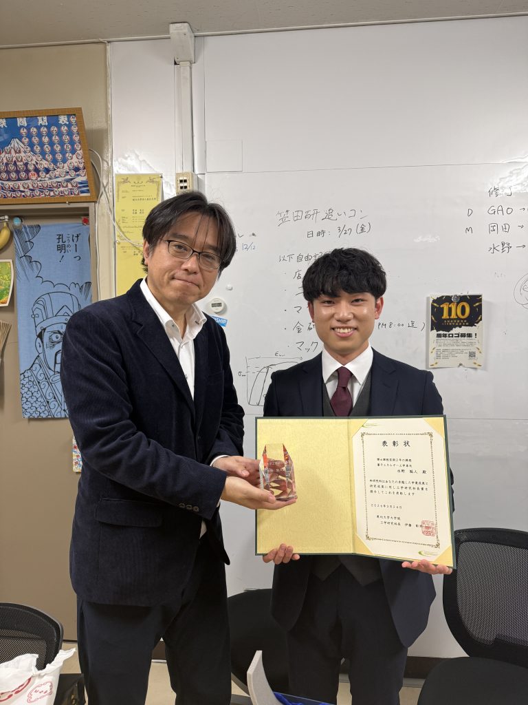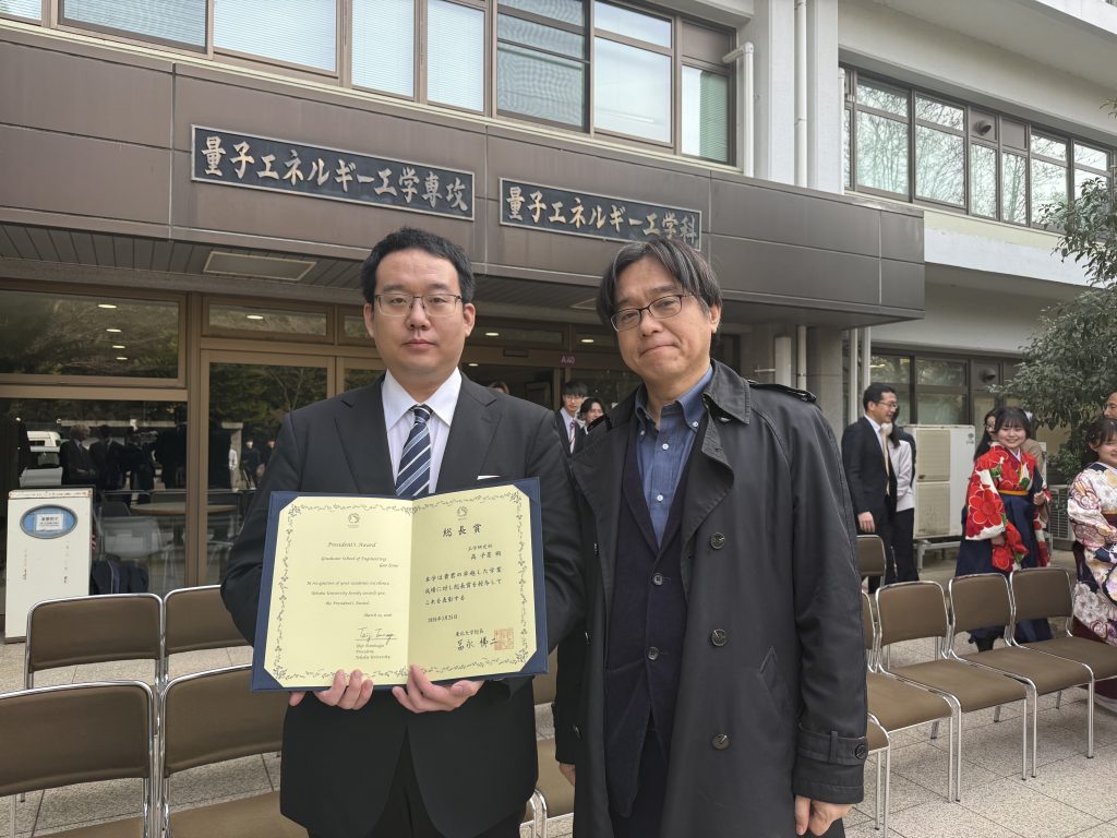 総長賞(Gao)、研究科長賞(水野)、日本原子力学会フェロー賞(上山) 大学院修了にあたり、笠田研より3名の学生が優秀学生として表彰されました。おめでとうございます。 総長賞 Gao Zimo 工学研究科長賞 水野魁人 日本原子力学会フェロー賞 上山魁 総長賞 工学研究科長賞