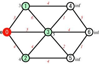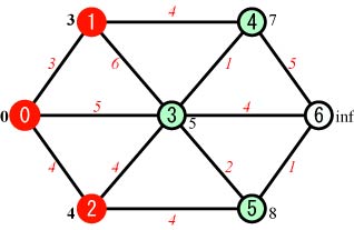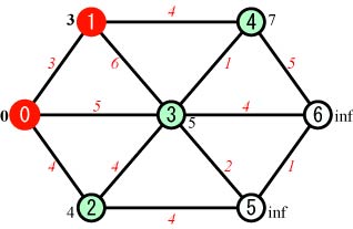 確定済ノード(赤)に隣接していないノードは無限大の距離を持つため、自然と確定済ノード(赤)に隣接するノード(緑)