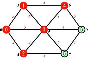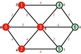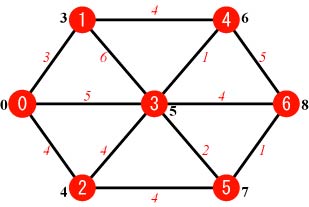 (0-1) 3 (0-2) 4 (0-3) 5 (1-3) 6 (1-4) 4 (2-3) 4 (2-5) 4 (3-4) 1 (3-5) 2 (3-6) 4 (4-6) 5 (5-6) 1 |