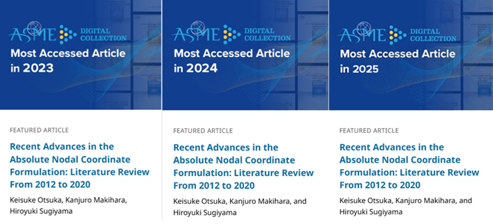 ANCFと呼ばれる大変形構造解析法に関するレビュー論文が、アメリカ機械学会誌の2023年・2024年・2025年の最多アクセス論文に連続して選ばれました。このオープンアクセス論文はどこからでもアクセスでき、この革新的な解析手法について理解を深めることができます。下のアイコンをクリックしてご覧ください。