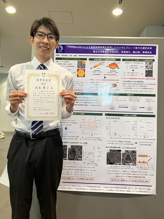 2024(令和6)年度 資源・素材学会東北支部春季大会にてM2佐藤さん、堀川さん、M1浅見さん、近藤さん、豊田さんがポスター発表を行いました。浅見さん、近藤さんが優秀発表賞(銅賞)を受賞しました。 浅見さん、近藤さん、おめでとうございます!! 受付を手伝ってくれたB4村山さんも交えて記念撮影📷