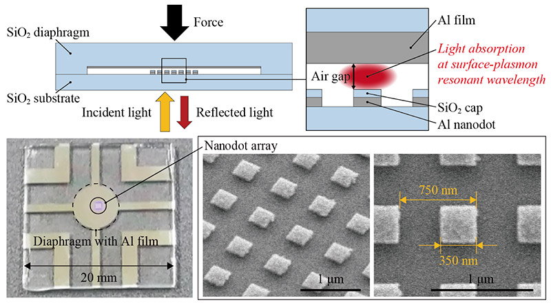 金属–誘電体–金属(MIM: Metal–Insulator–Metal)メタマテリアルを構成する誘電体層をエアギャップとすると、力によって誘電体層の厚みが変化する「可動メタマテリアル」を構成できる。反射スペクトルに見られる共鳴ピークシフトを測定することで、ダイアフラム上に加わる力を計測可能な光学力覚センサを開発した。このセンサは従来のファブリ・ペロー干渉式の光学力覚センサよりも高感度なセンサを実現できる。
