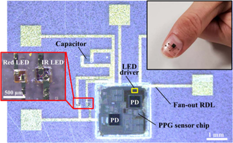 フレキシブルデバイスの性能、集積度、柔軟性を向上させるため、圧縮成型を基盤とするファンアウトウエハレベルパッケージ(FOWLP)技術を用い、異種デバイスのチップレットをフレキシブル基板に内蔵したヘテロインテグレーションに関する研究に取り組んだ。本研究では、光電式容積脈波(PPG)によるSpO2モニタリングを目的として、微小なチップの高精度アセンブリを実現し、μLEDと駆動回路、フォトダイオードなどをPDMSに集積することに成功した。