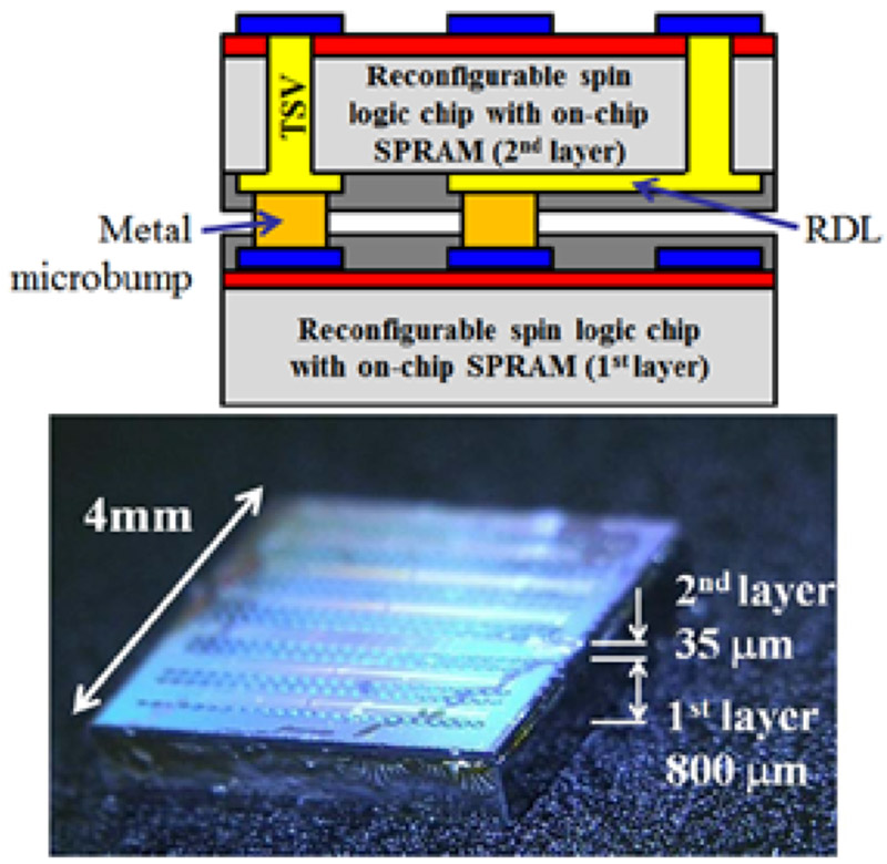 STT-MRAMスピン注入磁化反転(spin transfer torque:STT)と呼ぶデータ書き換え技術を用いた磁気抵抗変化型メモリであるが、耐熱性が低いという課題がある。本研究ではプロセスによる熱負荷を抑制することでSi貫通配線(Through Si Via: TSV)を用いたSTT-MRAMを有する集積回路チップの三次元積層化に成功した。