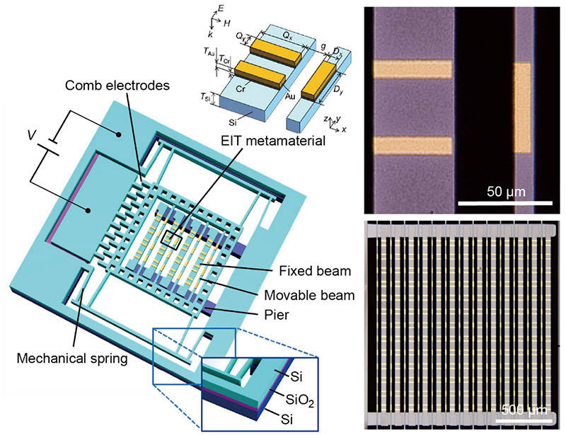 メタマテリアルの構成要素をマイクロアクチュエータにより可変とすることで、メタマテリアルの示す特異な光学特性と動的なチューナビリティを両立した「MEMSメタマテリアル」を実現できる。テラヘルツ帯で応答する電磁誘起透明化(EIT: Electromagnetically Induced Transparency)メタマテリアルにマイクロアクチュエータを組み込み、EITメタマテリアルを構成する双極子と四重極子の間のギャップを制御することで、透過率可変チューナブルフィルタを開発した。次世代無線通信(Beyond 5G/6G)を担うテラヘルツ波制御への応用が期待される。