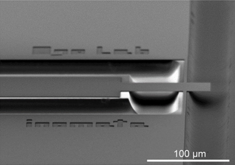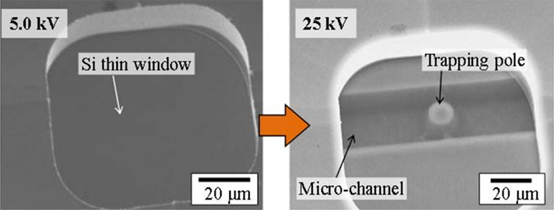 液体中の微小体を電子顕微鏡で観察できるよう、薄いSi窓を持つマイクロチャンネルを作製したものである。マイクロチャネル内部にポール状の微小体トラップ構造を設けており、酵母細胞やラテックス粒子の観察に成功した。